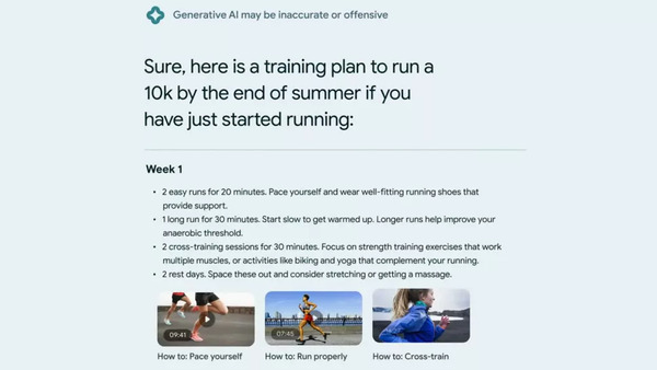 Thay đổi này được Google trình bày khá ngắn gọn trong bài thuyết trình của họ, bạn có thể yêu cầu Google đưa ra một kế hoạch luyện tập thể dục, thể thao để bạn tuân theo. AI Google sẽ cung cấp các hướng dẫn hàng tuần cũng như cách bạn có thể đạt được mục tiêu của mình cùng một số lời khuyên để bạn điều chỉnh cường độ luyện tập. Video hướng dẫn sẽ được cung cấp trong kết quả tìm kiếm để bạn biết thêm thông tin.