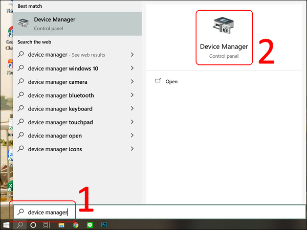 Bước 1: Vào mục Search → Nhập vào cụm từ “device manager” → Chọn Device Manager.