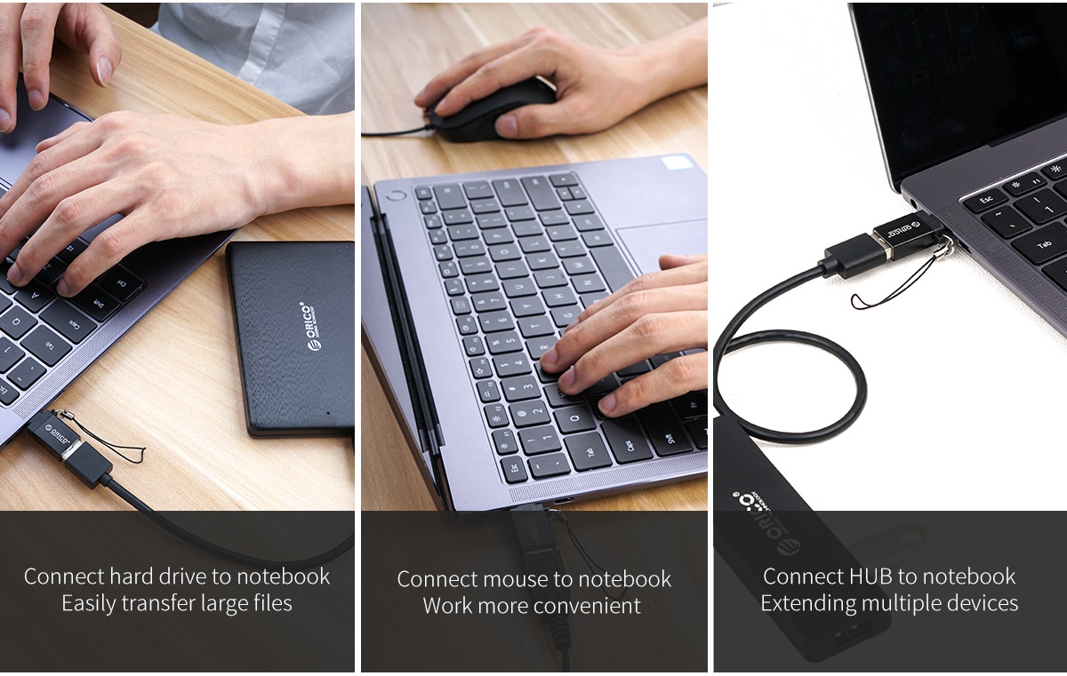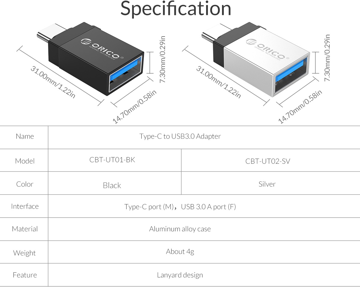 Adapter OTG Orico USB Type-A to USB Type-C CBT-UT0 Adapter OTG Orico USB Type-A to USB Type-C CBT-UT0 giúp bạn kết nối các thiết bị có chuẩn giao tiếp USB Type-A với các thiết bị có cổng USB Type-C như MacBook, SmartPhone. Thiết kế đảo ngược (cắm theo cả hai chiều) và tương thích ngược với các thiết bị USB hiện có USB 3.0 và USB 2.0. Hỗ trợ truyền dữ liệu cho điện thoại thông minh với tốc độ truyền tải USB 3.0 có thể lên đến 5Gbps, tương thích ngược USB 2.0 và USB 1.1 |
