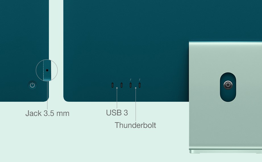 Dễ dàng kết nối iMac 2021 có trang bị jack tai nghe 3.5 mm tại cạnh trái của màn hình, nút nguồn và 4 cổng USB C ở mặt lưng, trong đó có 2 cổng Thunderbolt siêu nhanh, đem lại sự thuận tiện cho người dùng khi kết nối với các thiết bị ngoại vi. |