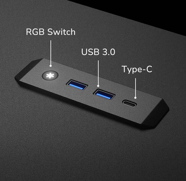 Cổng I/O Bàn Gaming COUGAR DEIMUS 120 trang bị cổng kết nối mở rộng USB 3.0 Type-A và Type-C tiện lợi và nút RGB để thay đổi các hiệu ứng đèn led. |