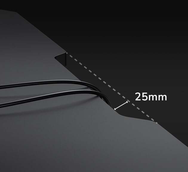Bảo vệ dây cáp Bàn Gaming COUGAR DEIMUS 120 thiết kế cạnh trong lõm giúp bảo vệ các dây cáp không bị cấn, gấp khúc và gãy khi đặt bàn vào góc tường. |