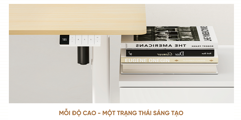 Bàn được trang bị bộ điều khiển điện tử thông minh với 3 chế độ bộ nhớ chiều cao, cho phép người dùng thiết lập các mức chiều cao ưa thích và chuyển đổi chỉ bằng một nút bấm. Tính năng này không chỉ tăng sự tiện lợi mà còn giúp tiết kiệm thời gian mỗi khi thay đổi tư thế làm việc. Ngoài ra, chức năng hẹn giờ nhắc điều chỉnh tư thế cùng âm thanh báo hiệu hỗ trợ cải thiện sức khỏe người dùng, tránh việc ngồi quá lâu một tư thế, từ đó tăng cường sự thoải mái và năng suất công việc.