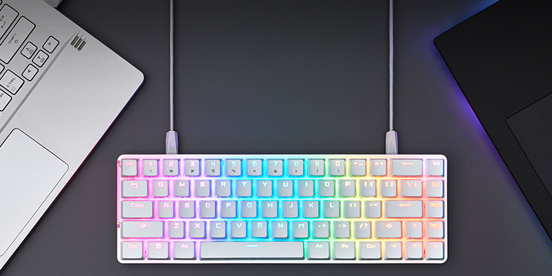 Bàn phím cơ ASUS ROG Falchion Ace có hai cổng USB-C ở hai bên của cạnh sau để thiết lập đi dây máy tính/ bàn làm việc gọn gàng hơn, cho phép bạn kết nối đồng thời hai PC và chuyển đổi nhanh giữa hai PC.