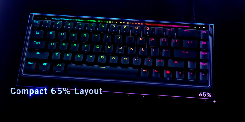 Bàn phím cơ ASUS ROG Falchion Ace HFX (ROG HFX Sw) được thiết kế theo layout 65% giúp tối ưu hóa không gian làm việc và chơi game. Với kích thước nhỏ gọn nhưng không thiếu đi các phím chức năng quan trọng, bàn phím mang đến sự tiện lợi và tính linh hoạt cao. Bề mặt phím được hoàn thiện tỉ mỉ với lớp vỏ chắc chắn, mang đến độ bền và cảm giác cao cấp khi sử dụng.
