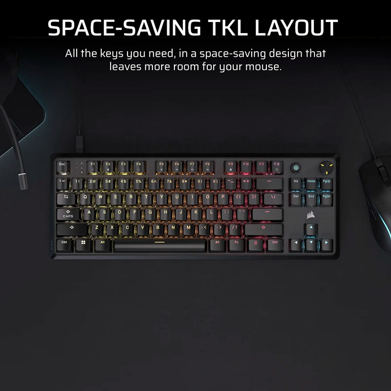 Bàn phím cơ Corsair K70 Core TKL RGB (Corsair MLX Sw) CH-911911E-NA sở hữu thiết kế TKL (Tenkeyless) nhỏ gọn, phù hợp cho những không gian làm việc và chơi game cần tối ưu diện tích. Với khung nhôm cao cấp và kiểu dáng hiện đại, sản phẩm không chỉ mang lại độ bền vượt trội mà còn tạo nên phong cách chuyên nghiệp. Hệ thống đèn RGB đa vùng giúp người dùng dễ dàng cá nhân hóa bàn phím với hàng triệu màu sắc và hiệu ứng ánh sáng độc đáo, mang đến trải nghiệm thị giác tuyệt vời.