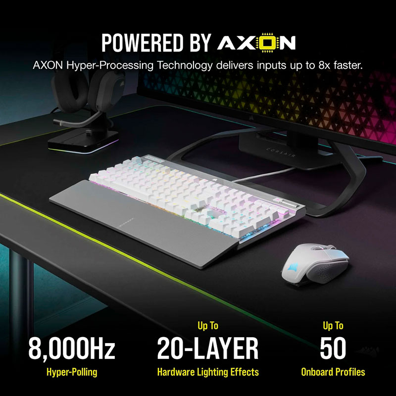 Nâng cao hiệu suất với AXON Trải nghiệm bàn phím chơi game tiên tiến nhất của Corsair cho đầu vào nhanh hơn gấp 4 lần với tần số báo cáo 8.000Hz và quét phím 4.000Hz, đồng thời tạo ra hiệu ứng ánh sáng 20 lớp. |