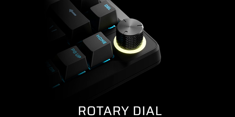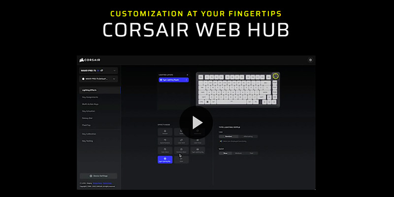 Góc phải của bàn phím được trang bị một núm xoay đa năng (Rotary Dial) bằng kim loại sang trọng. Bạn có thể sử dụng núm xoay này để điều chỉnh âm lượng, chuyển bài hát hoặc tùy biến để thực hiện các chức năng khác như cuộn trang, zoom ảnh... Một điểm cải tiến đáng giá khác là sự hỗ trợ của CORSAIR Web Hub. Giờ đây, bạn không cần phải cài đặt phần mềm nặng nề lên máy tính; thay vào đó, bạn có thể tùy chỉnh hiệu ứng đèn LED RGB, gán phím (remap), ghi macro và thiết lập Rapid Trigger trực tiếp trên trình duyệt web, cực kỳ tiện lợi khi mang bàn phím đi thi đấu ở quán net hoặc dùng máy lạ.