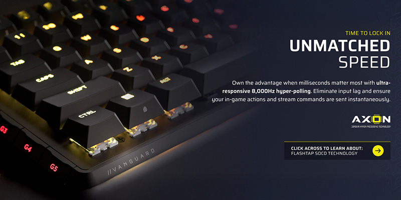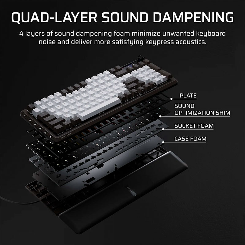Trải nghiệm gõ phím trên Bàn phím cơ Corsair Vanguard 96 RGB FlashTap SOCD (Corsair MLX Sw) được nâng lên một tầm cao mới nhờ vào hệ thống switch cơ học Corsair MLX Plasma độc quyền. Được mệnh danh là "Magic in every click", loại switch này được thiết kế để loại bỏ hoàn toàn hiện tượng rung lắc (Wobble-free) thường thấy trên các dòng switch thông thường. Sự ổn định này mang lại cảm giác gõ chắc chắn, đanh gọn và cực kỳ êm ái, giúp tăng cường sự tự tin trong từng thao tác nhấn. Phần vỏ switch trong suốt (Plasma) không chỉ tối ưu hóa khả năng dẫn sáng cho hệ thống đèn RGB rực rỡ mà còn đóng vai trò như một lớp bảo vệ bền bỉ. Dù bạn đang thực hiện các chuỗi combo nhanh hay soạn thảo văn bản dài, switch MLX Plasma luôn đảm bảo sự nhất quán và độ tin cậy tuyệt đối qua hàng triệu lần nhấn.