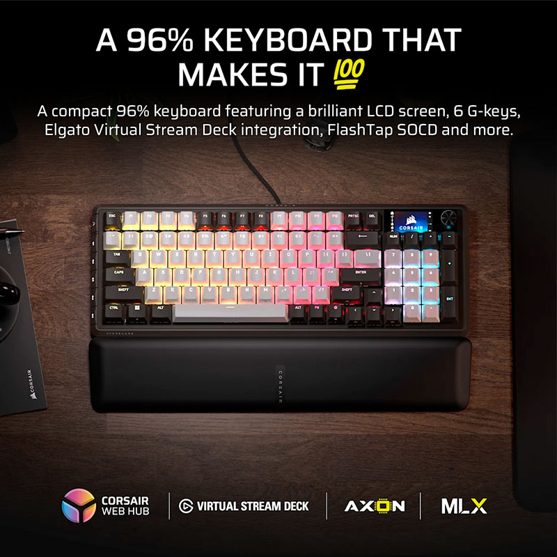Điểm nhấn thẩm mỹ và công nghệ nổi bật trên chiếc bàn phím này chính là màn hình LCD tích hợp rực rỡ, mở ra cánh cửa cho sự cá nhân hóa cấp độ tiếp theo (Next-level personalization). Màn hình này không chỉ đơn thuần hiển thị logo Corsair mà còn đóng vai trò như một bảng điều khiển trung tâm trực quan ngay trên mặt bàn phím. Người dùng có thể tùy biến để hiển thị các hình động GIF vui nhộn, thông số hệ thống theo thời gian thực, hoặc các thông báo quan trọng mà không cần phải Alt-Tab ra ngoài game. Sự hiện diện của màn hình LCD biến Vanguard 96 từ một thiết bị ngoại vi vô tri thành một phần mở rộng của cá tính người chơi, giúp góc máy (Battlestation) của bạn trở nên độc đáo và thu hút mọi ánh nhìn. Đây là sự kết hợp hoàn hảo giữa tính năng hữu dụng và vẻ đẹp công nghệ hiện đại.