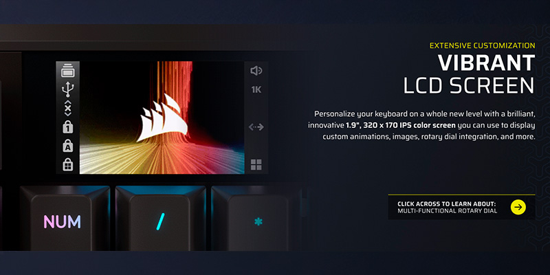 Điểm nhấn thẩm mỹ và công nghệ nổi bật trên chiếc bàn phím này chính là màn hình LCD tích hợp rực rỡ, mở ra cánh cửa cho sự cá nhân hóa cấp độ tiếp theo (Next-level personalization). Màn hình này không chỉ đơn thuần hiển thị logo Corsair mà còn đóng vai trò như một bảng điều khiển trung tâm trực quan ngay trên mặt bàn phím. Người dùng có thể tùy biến để hiển thị các hình động GIF vui nhộn, thông số hệ thống theo thời gian thực, hoặc các thông báo quan trọng mà không cần phải Alt-Tab ra ngoài game. Sự hiện diện của màn hình LCD biến Vanguard 96 từ một thiết bị ngoại vi vô tri thành một phần mở rộng của cá tính người chơi, giúp góc máy (Battlestation) của bạn trở nên độc đáo và thu hút mọi ánh nhìn. Đây là sự kết hợp hoàn hảo giữa tính năng hữu dụng và vẻ đẹp công nghệ hiện đại.