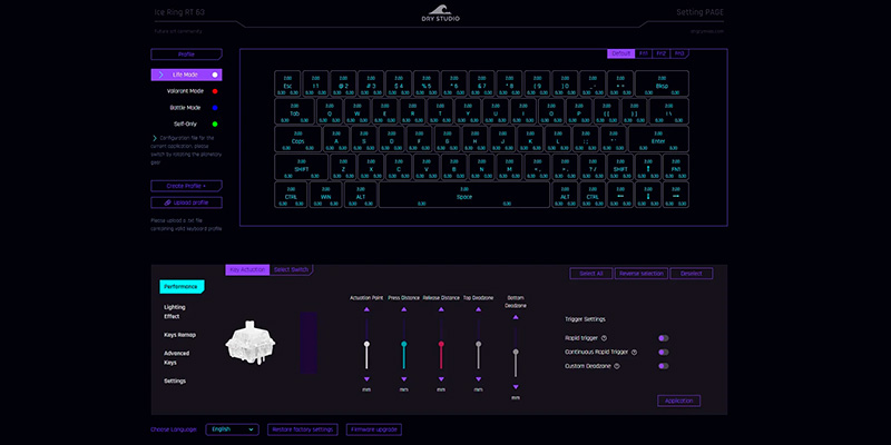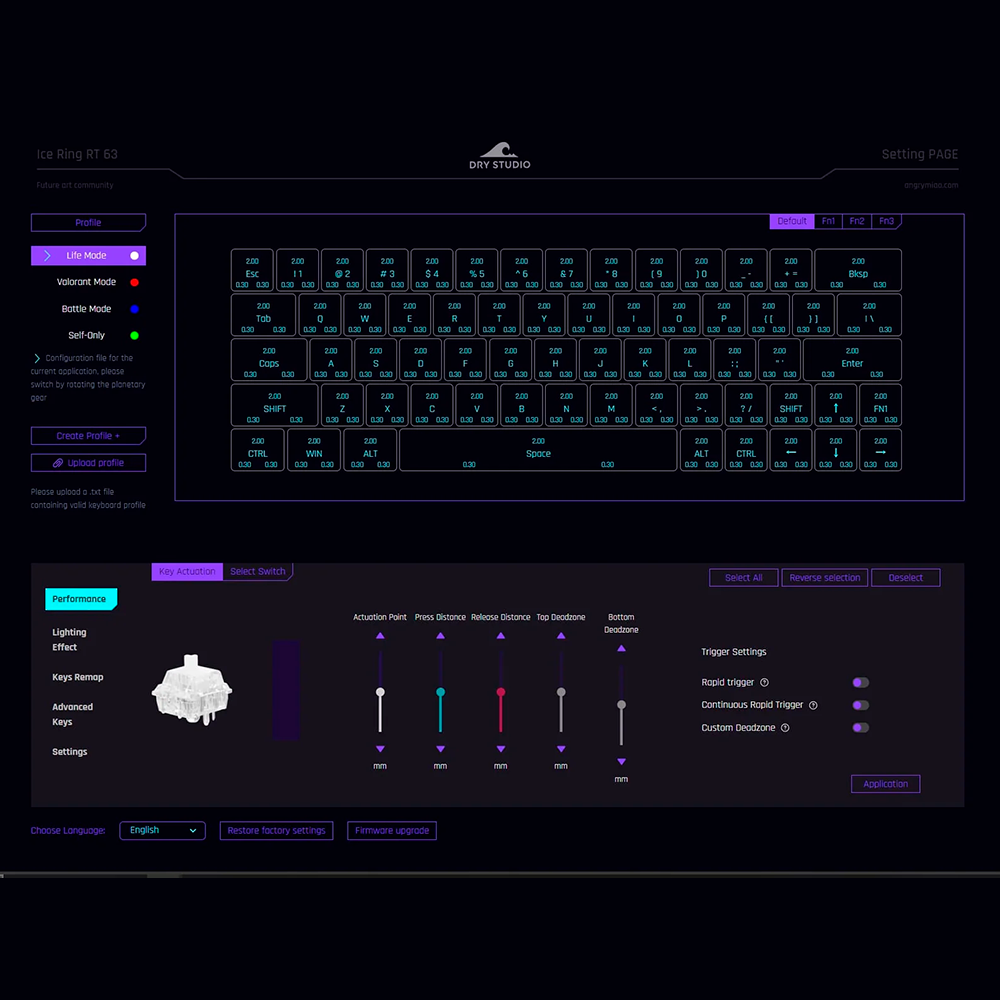 Điểm nhấn công nghệ của Dry Studio Ice Ring 63 RT chính là việc trang bị switch TTC King of Magnetic RGB (TTC KOM RGB), sử dụng công nghệ Hall Effect tiên tiến. Loại switch từ tính này cho phép bàn phím đạt được độ chính xác Rapid Trigger (RT) đáng kinh ngạc, chỉ 0.01 mm. Độ nhạy siêu cao này loại bỏ hoàn toàn "deadzone" và hiện tượng ghosting, đảm bảo mọi thao tác nhấn phím đều được ghi nhận tức thì và chính xác tuyệt đối. Sự hỗ trợ Hotswap cho phép người dùng linh hoạt thay đổi switch dễ dàng mà không cần hàn, tạo điều kiện tối ưu cho việc tùy chỉnh trải nghiệm gõ và hiệu năng cá nhân.