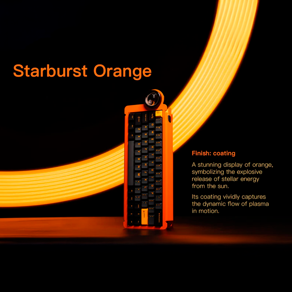 Bàn phím cơ Dry Studio Ice Ring 63 RT Starburst Orange RGB Hotswap 8K Rapid Trigger (Magnetic Sw) không chỉ là một thiết bị ngoại vi mà còn là một tác phẩm nghệ thuật với phiên bản màu Starburst Orange nổi bật. Màu cam rực rỡ này được hoàn thiện bằng công nghệ phủ (Coating) tinh xảo, tượng trưng cho năng lượng bùng nổ của sao chổi, tạo nên vẻ ngoài độc đáo và mạnh mẽ. Bàn phím sử dụng layout 60% (63 phím) gọn gàng, tối ưu không gian bàn làm việc, lý tưởng cho cả chơi game chuyên nghiệp và sử dụng hàng ngày. Phần thân bàn phím được chế tác nguyên khối từ Hợp kim nhôm CNC cao cấp, mang lại cảm giác chắc chắn, cao cấp và độ bền vượt trội. Trọng lượng bàn phím khoảng 0.74 kg tạo độ đầm ổn định khi gõ.