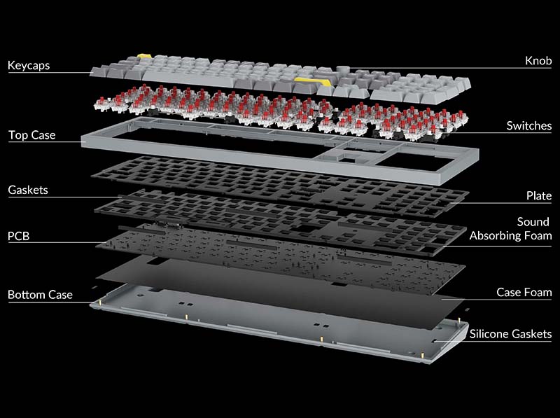 Double Gasket Mount Double Gasket Mount là sự cải tiến vượt bậc so với Gasket Mount thông thường bằng việc bố trí Gasket trên PCB cùng miếng đệm silicon giữa bottom case và top case giúp giảm thiểu tiếng ồn của kim kim loại. |