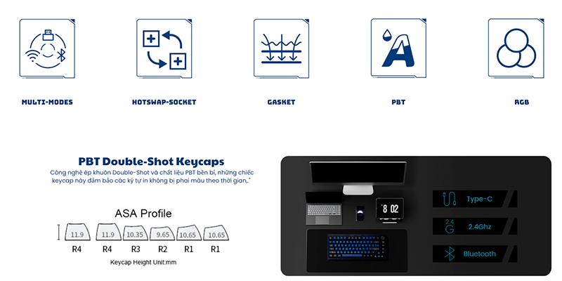 Bàn phím hỗ trợ Bluetooth 5.0, 2.4GHz và có dây USB-C, cho phép kết nối mượt mà với nhiều thiết bị khác nhau như PC, Mac, iPad và smartphone. Chế độ 2.4GHz giảm độ trễ tối đa, mang lại trải nghiệm gõ phím ổn định, không bị gián đoạn, phù hợp cho cả gaming và công việc đòi hỏi tốc độ nhập liệu nhanh. Pin dung lượng 3000mAh đảm bảo thời gian sử dụng kéo dài, giúp bạn thoải mái làm việc và chơi game mà không lo gián đoạn.