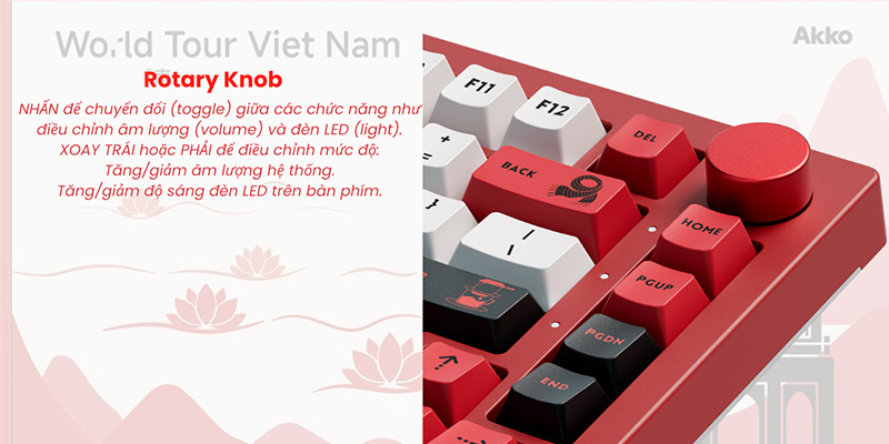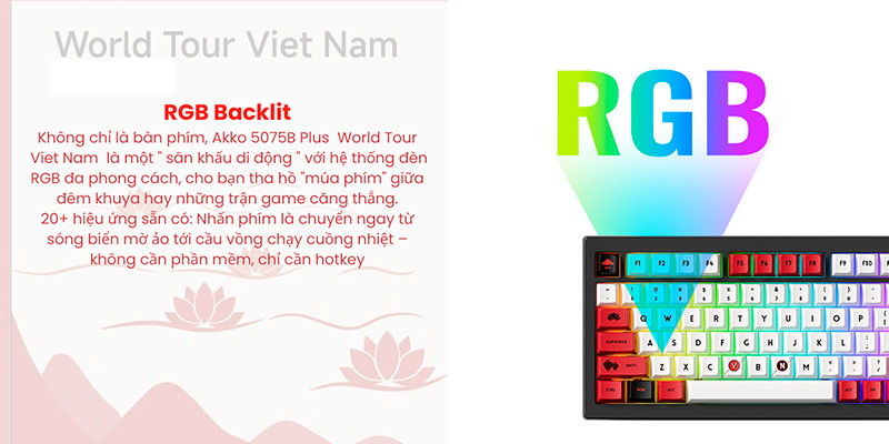 Bàn phím cơ không dây AKKO 5075B Plus World Tour Viet Nam RGB Hotswap (Akko Sw) sở hữu thiết kế lấy cảm hứng từ văn hóa Việt Nam với phiên bản Red World Tour Viet Nam và Black World Tour Viet Nam, mang đến sự độc đáo và tinh thần sưu tầm cao. Layout 75% với 83 phím gọn gàng, tối ưu không gian nhưng vẫn đầy đủ tính năng cần thiết. Chất liệu PBT Dye-Sublimation bền bỉ kết hợp công nghệ Side-Printed giúp duy trì tính thẩm mỹ lâu dài mà không lo mờ ký tự.