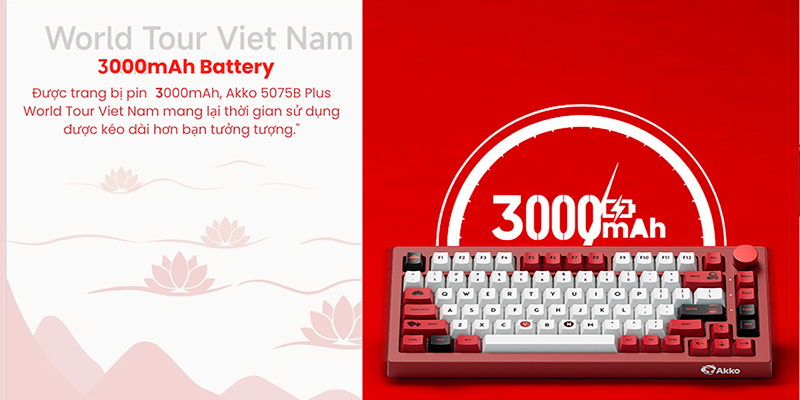Một ưu điểm vượt trội của Bàn phím cơ không dây AKKO 5075B Plus World Tour Viet Nam RGB Hotswap (Akko Sw) chính là pin 3000mAh dung lượng cao, cho phép sử dụng lâu dài mà không cần sạc thường xuyên. Cổng USB Type-C hỗ trợ sạc nhanh giúp tiết kiệm thời gian, đi kèm phụ kiện tiện ích như che bụi bàn phím và key puller. Với trọng lượng 1.2kg và kích thước 335 x 146 x 42mm, bàn phím vừa chắc chắn vừa gọn gàng, dễ dàng bố trí và mang theo.