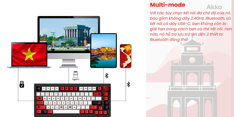 Bàn phím hỗ trợ Bluetooth 5.0, Wireless 2.4GHz và USB Type-C, mang đến sự linh hoạt tối đa cho người dùng. Với khả năng kết nối đa thiết bị, người dùng có thể dễ dàng chuyển đổi giữa laptop, PC hay tablet chỉ bằng một thao tác nhanh chóng. Điều này giúp AKKO 5075B Plus World Tour Viet Nam trở thành lựa chọn lý tưởng cho người dùng thường xuyên làm việc đa nhiệm hoặc cần sự tiện lợi khi di chuyển.