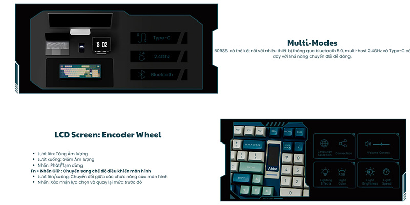 Với khả năng kết nối đa chế độ, bàn phím AKKO 5098B Ink Green hỗ trợ Bluetooth 5.0, 2.4GHz và kết nối có dây USB Type-C, giúp người dùng dễ dàng chuyển đổi giữa các thiết bị khác nhau. Tính năng này mang lại sự tiện lợi và linh hoạt, phù hợp cho cả công việc và giải trí.