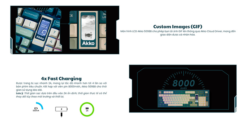 Với dung lượng pin lên đến 8000mAh, bàn phím AKKO 5098B Ink Green cho phép sử dụng liên tục trong thời gian dài mà không lo gián đoạn. Tính năng sạc nhanh 2A giúp nạp đầy năng lượng nhanh chóng, đảm bảo bàn phím luôn sẵn sàng đồng hành cùng bạn trong mọi hoạt động.