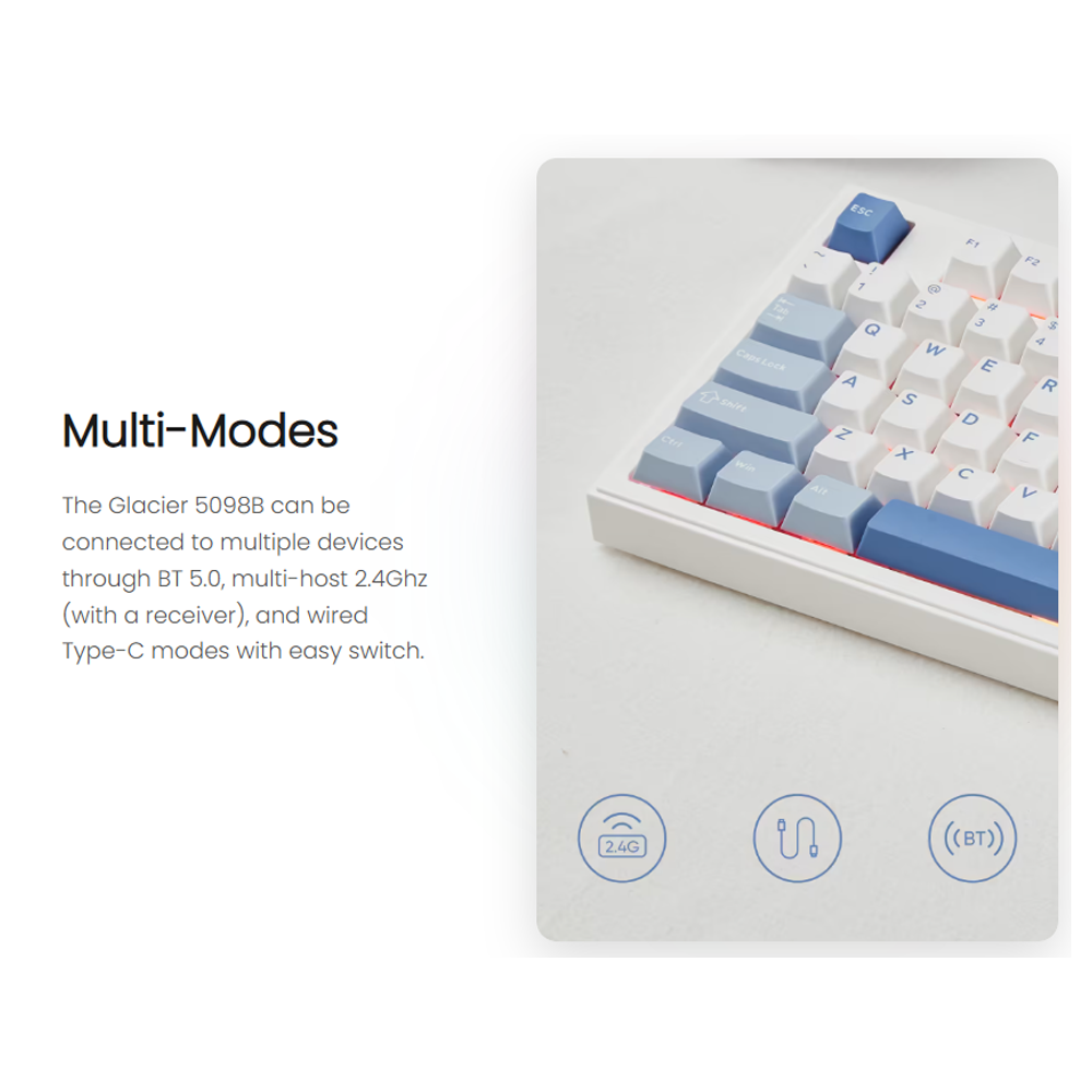 AKKO 5098B hỗ trợ 3 chế độ kết nối linh hoạt gồm Bluetooth 5.0, Wireless 2.4GHz và USB Type-C có dây. Với Bluetooth 5.0, bạn có thể kết nối cùng lúc nhiều thiết bị và chuyển đổi nhanh chỉ với một phím bấm. Chế độ 2.4GHz đảm bảo tốc độ phản hồi gần như tức thì, lý tưởng cho game thủ, trong khi USB Type-C tháo rời mang đến sự tiện lợi và độ ổn định cao cho công việc.