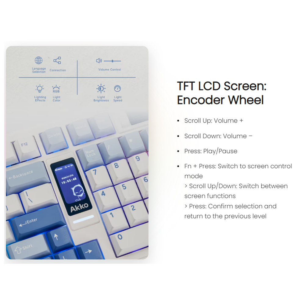 Điểm nổi bật nhất trên AKKO 5098B là màn hình LCD 5098B Series, cho phép hiển thị ảnh động GIF, thông tin hệ thống hoặc các hiệu ứng tùy chỉnh cá nhân hóa. Thông qua phần mềm AKKO Cloud Driver, người dùng có thể dễ dàng thay đổi giao diện, thiết lập thông số hiển thị, và tạo nên phong cách riêng biệt cho bàn phím. Tích hợp bộ mã hóa đa chức năng giúp điều chỉnh âm lượng, phát/ tạm dừng nhạc, chuyển đổi chế độ đèn nhanh chóng và tiện lợi.