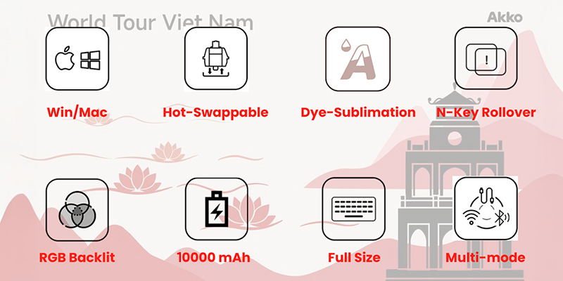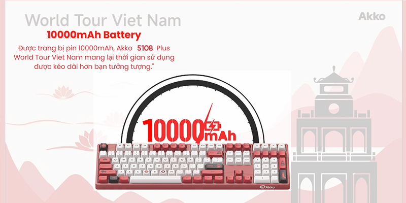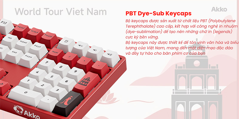 Bàn phím cơ không dây AKKO 5108B Plus World Tour Viet Nam RGB Hotswap (Akko Sw) mang phong cách Red World Tour Viet Nam nổi bật, tái hiện những chi tiết văn hóa Việt Nam trên từng keycap. Layout Fullsize 108 phím đáp ứng nhu cầu nhập liệu, làm việc văn phòng lẫn gaming. Vỏ và keycap được làm từ PBT Dye-Sublimation bền bỉ, cho cảm giác gõ chắc chắn và thẩm mỹ cao, đồng thời hạn chế mài mòn sau thời gian dài sử dụng.