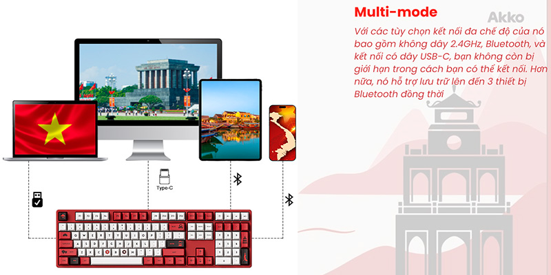 Sản phẩm hỗ trợ Bluetooth 5.0, Wireless 2.4GHz và USB Type-C, cho phép kết nối nhanh chóng với nhiều thiết bị. Người dùng có thể dễ dàng chuyển đổi giữa các chế độ chỉ bằng thao tác đơn giản, phù hợp khi cần làm việc đa nhiệm trên laptop, PC và tablet. Nhờ tính năng này, AKKO 5108B Plus World Tour Viet Nam trở thành lựa chọn tối ưu cho cả môi trường văn phòng lẫn di chuyển.