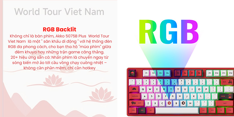 Bàn phím hỗ trợ LED RGB rực rỡ với nhiều hiệu ứng ánh sáng đa dạng, có thể tùy chỉnh trực tiếp hoặc qua phần mềm Akko Cloud Driver. Hệ thống chiếu sáng không chỉ tăng thêm tính thẩm mỹ mà còn tạo cảm hứng khi gõ phím hoặc chơi game trong điều kiện thiếu sáng. Người dùng có thể đồng bộ ánh sáng theo sở thích để biến Bàn phím cơ không dây AKKO 5108B Plus World Tour Viet Nam thành điểm nhấn nổi bật trên bàn làm việc.