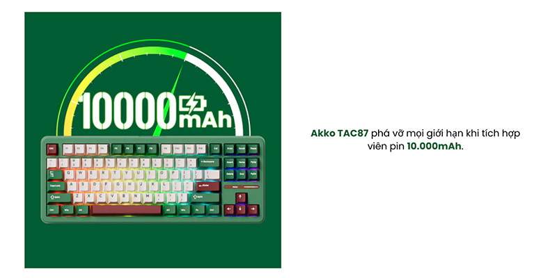 Một trong những ưu điểm nổi bật nhất của AKKO TAC87 Multi Mode RGB Hotswap chính là viên pin dung lượng 10.000mAh khổng lồ, mang lại thời lượng sử dụng bền bỉ vượt xa nhiều bàn phím cơ khác trên thị trường. Người dùng có thể thoải mái làm việc hoặc chơi game nhiều ngày liền mà không lo gián đoạn, đặc biệt ngay cả khi bật chế độ LED RGB toàn dải màu. Viên pin lớn không chỉ đảm bảo sự ổn định khi dùng ở chế độ không dây mà còn giúp giảm tần suất sạc, nâng cao tính tiện lợi. Với thời gian chờ dài và khả năng sạc nhanh qua cổng USB-C hiện đại, đây là lựa chọn hoàn hảo cho những ai thường xuyên di chuyển và cần một bàn phím bền bỉ, đáng tin cậy.