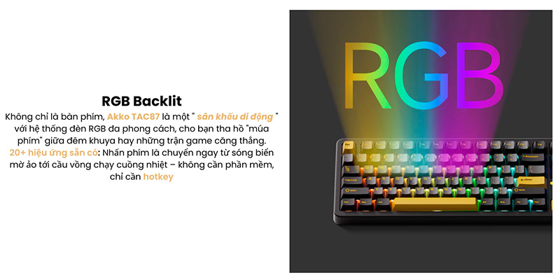 AKKO TAC87 Multi Mode RGB Hotswap (AKKO Sw) được trang bị đèn nền RGB 16,8 triệu màu với hơn 20 hiệu ứng ánh sáng tích hợp sẵn, từ sóng biển mượt mà cho đến vòng sáng rực rỡ. Người dùng có thể dễ dàng thay đổi hiệu ứng chỉ bằng tổ hợp phím tắt (hotkey) mà không cần phần mềm, mang lại sự tiện lợi cao. RGB không chỉ là yếu tố trang trí mà còn tạo nên bầu không khí đậm chất gaming, tăng sự hứng khởi khi làm việc về đêm hay trong những trận đấu căng thẳng. Hệ thống ánh sáng này cũng có thể tùy biến để đồng bộ cùng setup của bạn, biến bàn phím thành một “sân khấu thu nhỏ” ngay trên bàn làm việc.