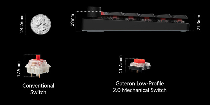 Gateron Low Profile switch là một switch cơ học được tối ưu hóa hơn những switch cơ học thông thường khi được thiết kế siêu mỏng có thể được sử dụng trên các bàn phím cơ cấu hình thấp. Low Profile switch có khoảng cách di chuyển ngắn hơn và hoạt động nhanh hơn switch thông thường, mang lại cảm giác gõ phím nhanh, mượt mà.
