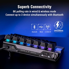 Bàn phím hỗ trợ 3 chế độ kết nối gồm USB-C, Bluetooth và RF 2.4GHz, cho phép linh hoạt sử dụng trên nhiều thiết bị. Công nghệ ROG SpeedNova 8K mang đến polling rate 8000Hz, giảm độ trễ từ 1ms xuống chỉ 0.125ms, đảm bảo tín hiệu phím gần như tức thì. Chế độ ROG Zone Mode tắt LED, tối ưu cảm biến Hall và giữ 8000Hz cho các phím thi đấu, giúp bạn tập trung tối đa vào trận game. Đây là lựa chọn hoàn hảo cho game thủ eSports chuyên nghiệp cần tốc độ phản hồi vượt trội.