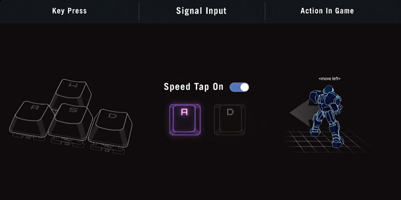 Chế độ Speed Tap Mode trên Bàn phím cơ không dây ASUS ROG Falcata HFX (ROG HFX V2 Sw) cho phép khi nhấn cùng lúc hai phím điều hướng đối lập (ví dụ A + D), hệ thống sẽ ưu tiên lệnh từ phím được nhấn sau và tự động nhả phím trước. Điều này giúp nhân vật trong game FPS chuyển hướng ngay lập tức thay vì bị khựng lại, loại bỏ khoảng trễ khi counter-strafing và đảm bảo ngắm bắn chính xác trong mọi tình huống. Tính năng này mặc định tắt và có thể kích hoạt nhanh bằng cách nhấn đồng thời Fn + Caps trong 1 giây.