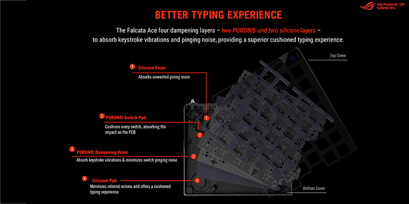Bàn phím cơ không dây ASUS ROG Falcata HFX (ROG HFX V2 Sw) sở hữu 4 lớp foam giảm chấn gồm 2 lớp PORON® và 2 lớp silicone, triệt tiêu tiếng pinging và giảm rung chấn, mang lại cảm giác gõ êm và chắc tay. Bộ stabilizer pre-lubed giúp phím dài như Space, Shift, Enter gõ mượt mà, không bị lệch. Keycap PBT Doubleshot mid-height chống mài mòn, giảm wobble, đảm bảo độ bền và cảm giác gõ ổn định, phù hợp cho cả chơi game lẫn gõ văn bản dài.