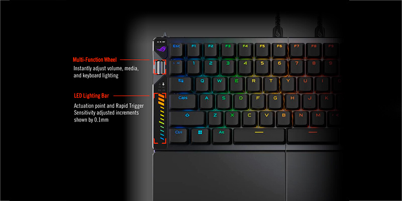 Bàn phím sử dụng ROG HFX V2 Magnetic Switch với tuổi thọ 100 triệu lần nhấn, hành trình phím 3.5mm, lực nhấn khởi đầu 35gf và tổng lực 49gf. Điểm mạnh là khả năng tùy chỉnh điểm kích hoạt từ 0.1mm – 3.5mm với độ chính xác 0.01mm, giúp người dùng tối ưu tốc độ phản hồi theo sở thích. Thiết kế stem walled tăng độ ổn định, chống bụi bẩn xâm nhập, đồng thời tương thích hầu hết keycap aftermarket, cho phép dễ dàng nâng cấp ngoại hình và cảm giác gõ.