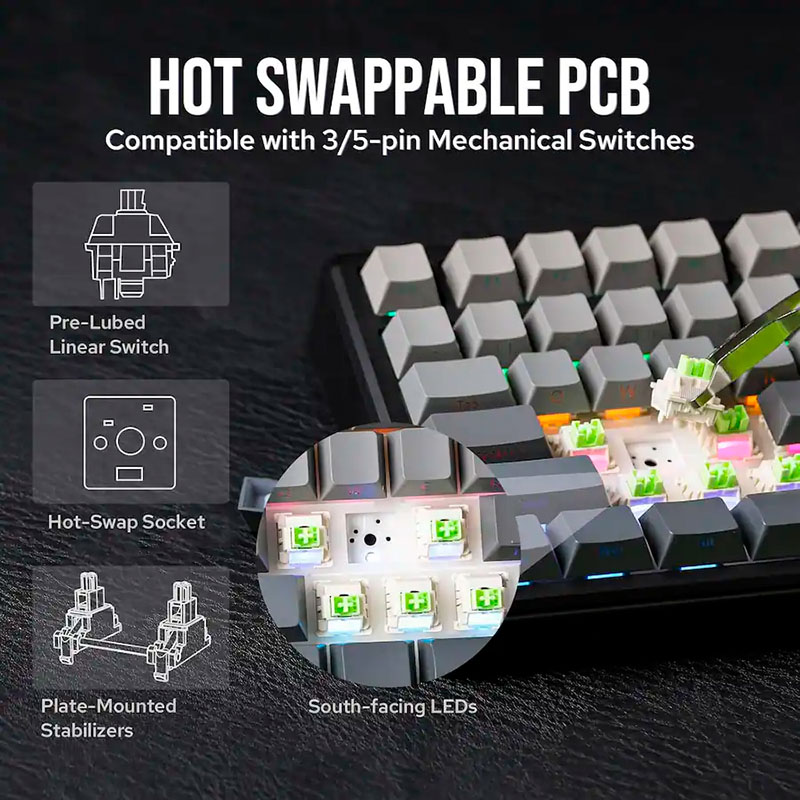 Trái tim của trải nghiệm gõ phím trên AULA F75 Max nằm ở hệ thống Reaper switch đến từ thương hiệu Leobog danh tiếng. Đây là loại switch mang lại âm thanh gõ phím Linear êm ái, mượt mà và không gây tiếng ồn lớn, rất phù hợp cho môi trường văn phòng hoặc chơi game vào ban đêm. Với độ bền phím 60 triệu lần bấm, bạn hoàn toàn có thể yên tâm về tuổi thọ và độ ổn định của switch trong suốt quá trình sử dụng lâu dài. Bên cạnh đó, tính năng Hot-Swap cho phép người dùng dễ dàng thay thế switch mà không cần kỹ năng hàn mạch phức tạp. Điều này mở ra khả năng tùy biến vô tận, giúp bạn tự do thử nghiệm các loại switch khác nhau để tìm ra cảm giác gõ ưng ý nhất, biến chiếc bàn phím trở thành một công cụ mang đậm dấu ấn cá nhân độc bản.