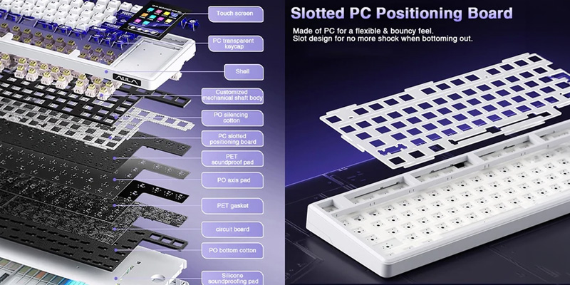 Bàn phím cơ không dây AULA L99 mang đến một cuộc cách mạng trong trải nghiệm người dùng nhờ được trang bị màn hình cảm ứng TFT kích thước lớn lên đến 3.98 inch. Chiếc màn hình này không chỉ là điểm nhấn công nghệ độc đáo về mặt thẩm mỹ mà còn cho phép bạn tương tác trực tiếp, tùy chỉnh các hiệu ứng, hình ảnh hiển thị hay theo dõi dung lượng pin một cách vô cùng trực quan. Kết hợp với layout 84 phím nhỏ gọn, sản phẩm vừa tối ưu hóa diện tích bàn làm việc vừa đảm bảo cung cấp đầy đủ các phím chức năng cần thiết cho cả nhu cầu làm việc lẫn giải trí đỉnh cao.