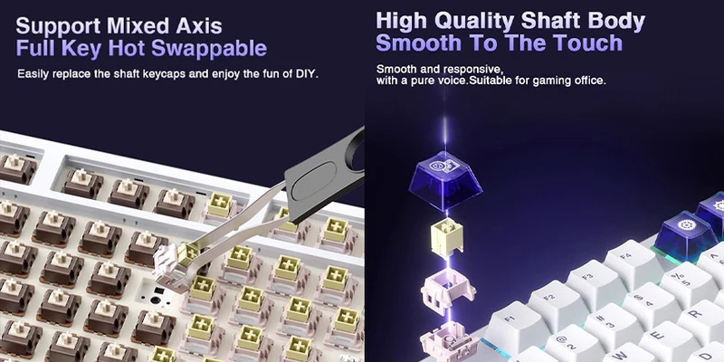 Trải nghiệm gõ phím trên AULA L99 được nâng tầm xuất sắc nhờ việc sử dụng Raindrop Switch với đặc trưng hành trình phím tuyến tính (Linear) siêu mượt mà. Loại switch này sở hữu độ bền ấn tượng lên đến 60 triệu lần nhấn, kết hợp hoàn hảo cùng cấu trúc Gasket Mount cao cấp giúp triệt tiêu tối đa tiếng ồn và độ rung vang khi gõ. Đặc biệt, bảng mạch của phím được thiết kế dạng mạch xuôi kết hợp cùng tính năng Hot-Swap toàn diện, tạo điều kiện thuận lợi để những người đam mê phím cơ có thể dễ dàng nhổ và thay thế switch theo sở thích cá nhân mà không cần thao tác rã hàn phức tạp.