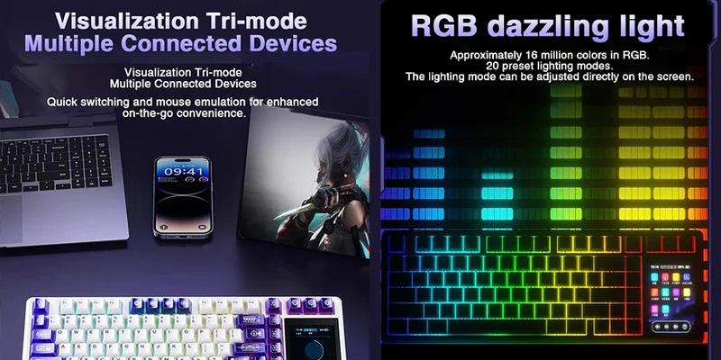 2. Màn hình cảm ứng trên phím có tác dụng gì? Màn hình LCD cảm ứng TFT 3.98 inch cho phép bạn xem nhanh các thông số như dung lượng pin, thời gian, tương tác trực tiếp để tùy chỉnh hiệu ứng đèn LED RGB, hoặc hiển thị hình ảnh động/tĩnh mang đậm dấu ấn cá nhân mà không cần mở phần mềm trên máy tính.