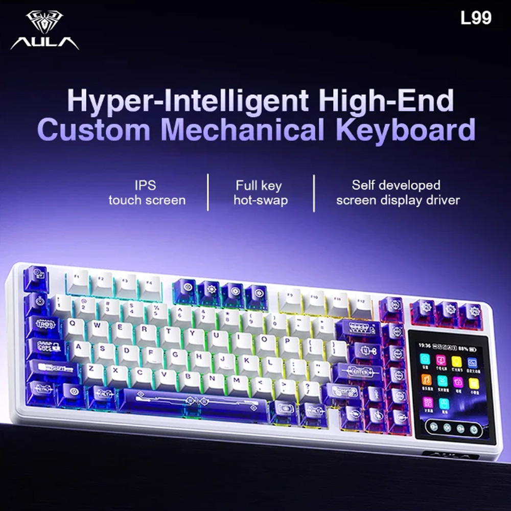 Bàn phím cơ không dây AULA L99 LCD Touchscreen RGB Hotswap (Raindrop Sw) mang đến một chuẩn mực mới cho góc làm việc và giải trí của bạn với sự kết hợp hoàn hảo giữa công nghệ màn hình cảm ứng tương tác, cảm giác gõ êm ái đỉnh cao từ cấu trúc Gasket Mount và khả năng kết nối đa nền tảng linh hoạt.