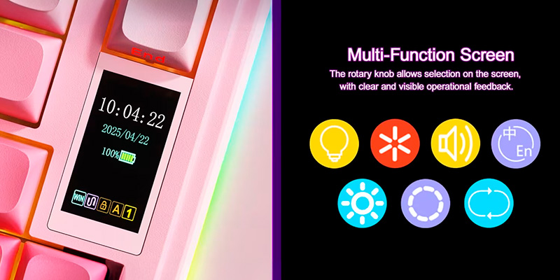 Bàn phím cơ không dây AULA S75 Pro Stellar Black LCD Screen RGB Hotswap (Huano Sw) mang đến sự đổi mới vượt bậc với màn hình LCD tích hợp ngay trên thân phím. Màn hình này không chỉ để trang trí mà còn cung cấp thông tin thời gian thực quan trọng như trạng thái pin, ngày giờ, hệ điều hành đang sử dụng và hiệu ứng đèn nền hiện tại. Người dùng có thể tùy biến màn hình bằng các hình ảnh động GIF độc đáo thông qua phần mềm điều khiển, tạo nên dấu ấn cá nhân riêng biệt. Bên cạnh màn hình là núm xoay đa chức năng (multi-function knob), cho phép điều chỉnh nhanh âm lượng, chuyển đổi các chế độ đèn nền hoặc tùy chỉnh thông số trên màn hình LCD một cách trực quan mà không cần thao tác phức tạp trên máy tính. Sự kết hợp này biến chiếc bàn phím thành một trung tâm điều khiển tiện lợi ngay trong tầm tay.