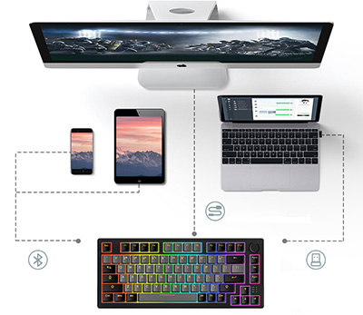 Tương thích đa thiết bị Bàn phím cơ không dây Dareu EK75 Pro Black-Gold hoạt động với macOS, iOS, Windows và Android. |