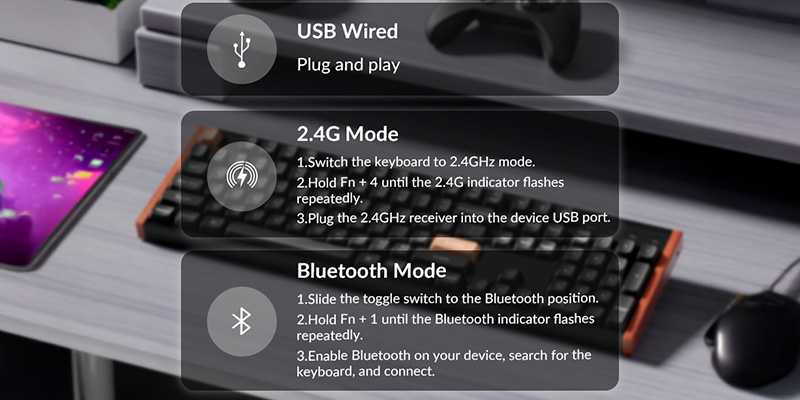 K10 HE Special Edition hỗ trợ ba chế độ kết nối linh hoạt gồm Bluetooth 5.2, 2.4GHz Wireless, và Type-C có dây, cho phép chuyển đổi nhanh giữa laptop, PC, tablet hoặc smartphone. Dây Type-A to Type-C đi kèm giúp sạc nhanh và truyền tín hiệu ổn định. Bên trong là pin lithium 4000mAh dung lượng lớn, cho thời gian sử dụng lên đến 120 giờ khi tắt đèn nền RGB, mang đến sự tiện lợi tối đa cho người thường xuyên di chuyển. Bàn phím tương thích hoàn hảo với Windows, macOS và Linux, giúp người dùng dễ dàng tùy chỉnh layout phù hợp theo từng hệ điều hành.