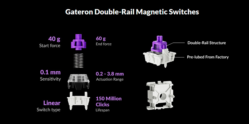 Keychron K2 HE Special Edition RGB Hotswap Aluminum (Magnetic Sw) là chiếc bàn phím không dây 75% đầu tiên sử dụng switch từ tính Gateron Double-Rail Magnetic, cho phép người dùng tùy chỉnh điểm nhận phím từ 0.2mm đến 3.8mm. Công nghệ Rapid Trigger và Dynamic Keystroke (DKS) giúp thực thi nhiều thao tác trên một phím theo độ sâu nhấn – tối ưu hóa tốc độ và độ phản hồi trong các tựa game FPS hoặc thao tác chuyên sâu.