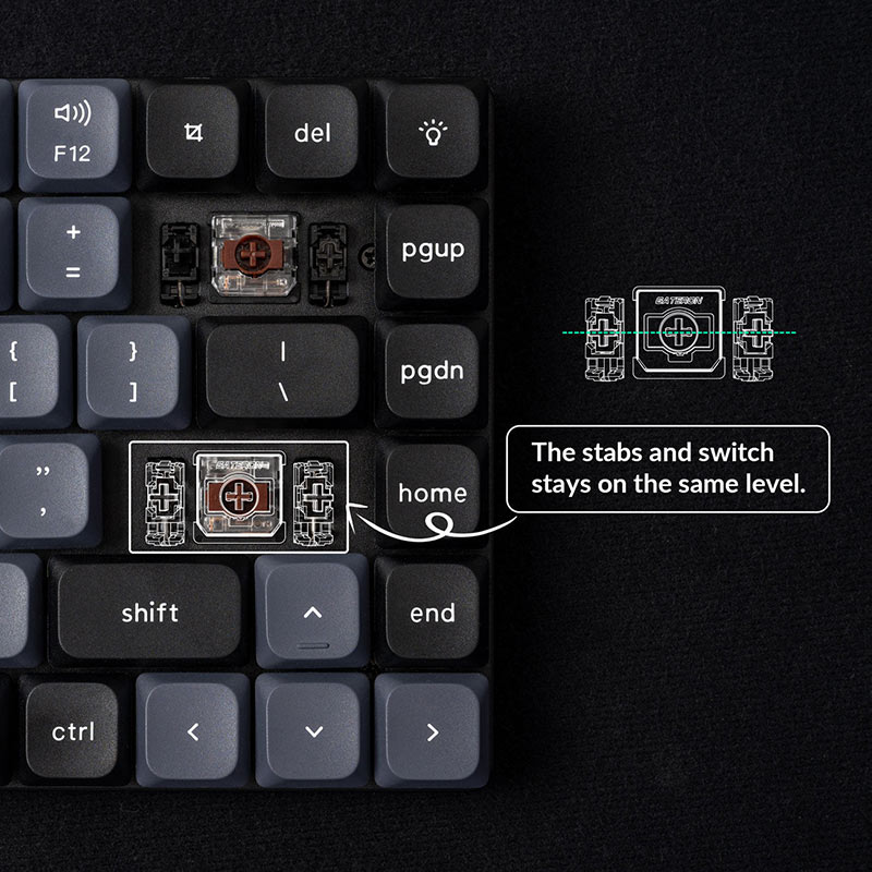 Bộ Stabilizers mới Bàn phím cơ không dây Keychron K3 Pro RGB HotSwap với thiết kế mới giúp tăng cường độ ổn định, ít rung lắc hơn cải thiện cảm giác gõ phím tốt hơn đối với những phím lớn. |