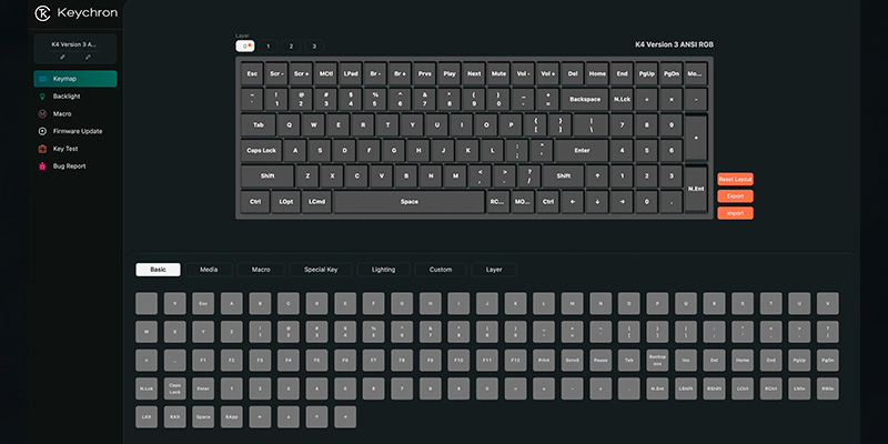 Keychron K4 V3 QMK RGB (Keychron Sw) hỗ trợ firmware QMK, cho phép người dùng tùy chỉnh phím, macro và layout thông qua Keychron Launcher Web App trực tiếp trên trình duyệt. Từ việc remap phím tắt, tạo tổ hợp chức năng đến macro phức tạp – tất cả đều được thực hiện dễ dàng mà không cần kỹ năng lập trình. Đây là lựa chọn lý tưởng cho lập trình viên, designer hoặc những ai muốn cá nhân hóa hoàn toàn bàn phím của mình.