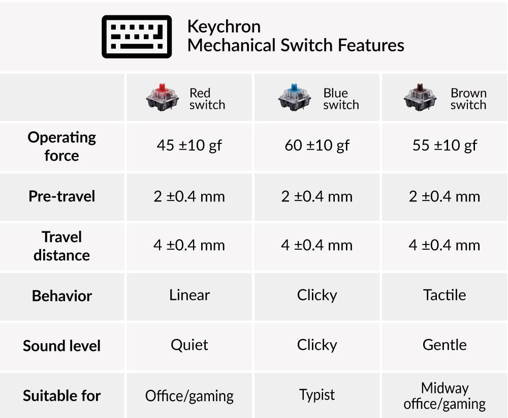 Keychron Red (Linear, Yên tĩnh) Keychron Blue (Clicky, Có tiếng,Khấc) Keychron Brown (Tactile, Có khấc) |