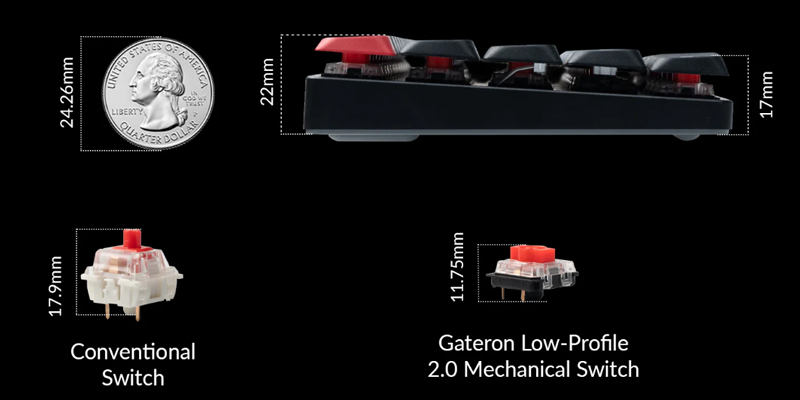 Gateron Low Profile switch là một switch cơ học được tối ưu hóa hơn những switch cơ học thông thường khi được thiết kế siêu mỏng có thể được sử dụng trên các bàn phím cơ cấu hình thấp. Low Profile switch có khoảng cách di chuyển ngắn hơn và hoạt động nhanh hơn switch thông thường, mang lại cảm giác gõ phím nhanh, mượt mà.