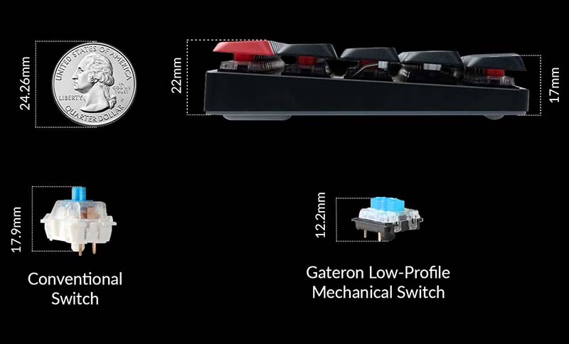 Switch Gateron Low Profile Gateron Low Profile switch là một switch cơ học được tối ưu hóa hơn những switch cơ học thông thường khi được thiết kế siêu mỏng có thể được sử dụng trên các bàn phím cơ cấu hình thấp. Low Profile switch có khoảng cách di chuyển ngắn hơn và hoạt động nhanh hơn switch thông thường, mang lại cảm giác gõ phím nhanh, mượt mà. |